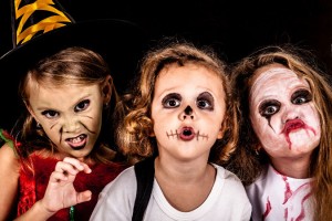 Happy brother and two sisters on Halloween party